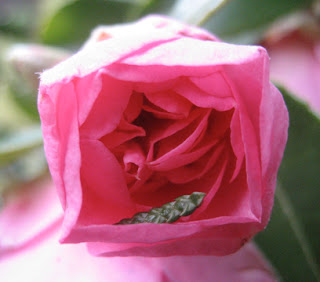 The almost perfectly square parting petals of this camellia reveal a hidden cedar needle shard. In art, sometimes you need to observe from inches away in order to see the surprising elements.