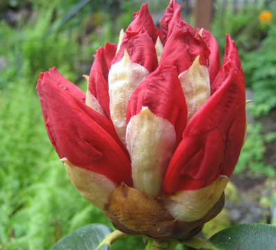 The Rhody has opened up a bit, revealing shriveled leaves ready to unfurl. It reminds of when artichokes open, becoming new forms with their pointy leaves splayed out. Here the new form will be big, soft and flouncy.